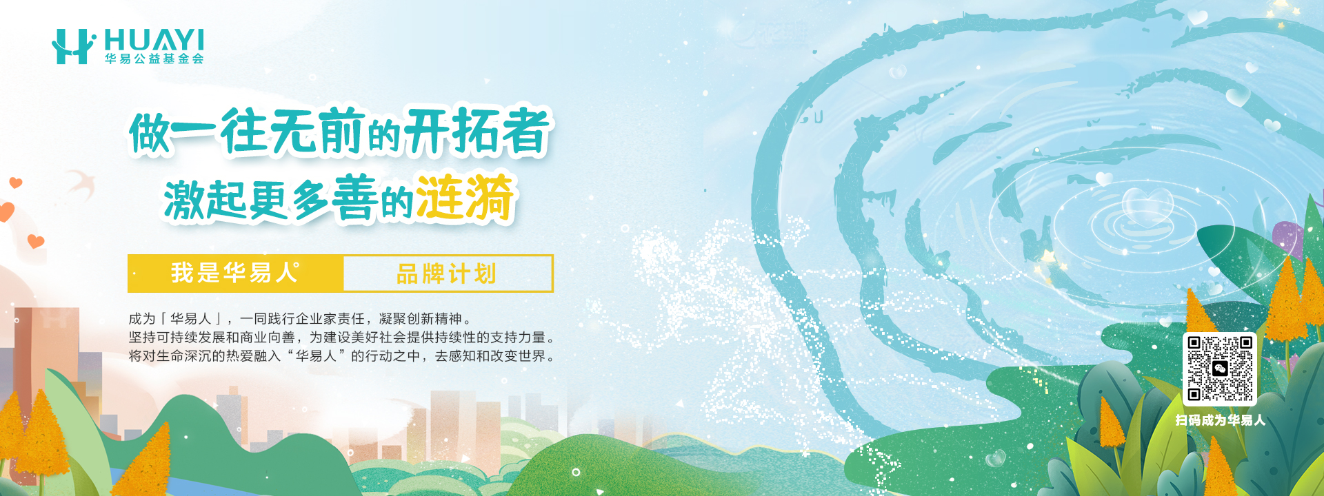 践行企业家责任,凝聚创新精神,整合各界资源坚持可持续发展和商业向善,为建设美好社会提供持续性的支持力量。联合、连续、链接,将对生命深沉的热爱融入“华易人”的行动之中,去感知和改变世界。